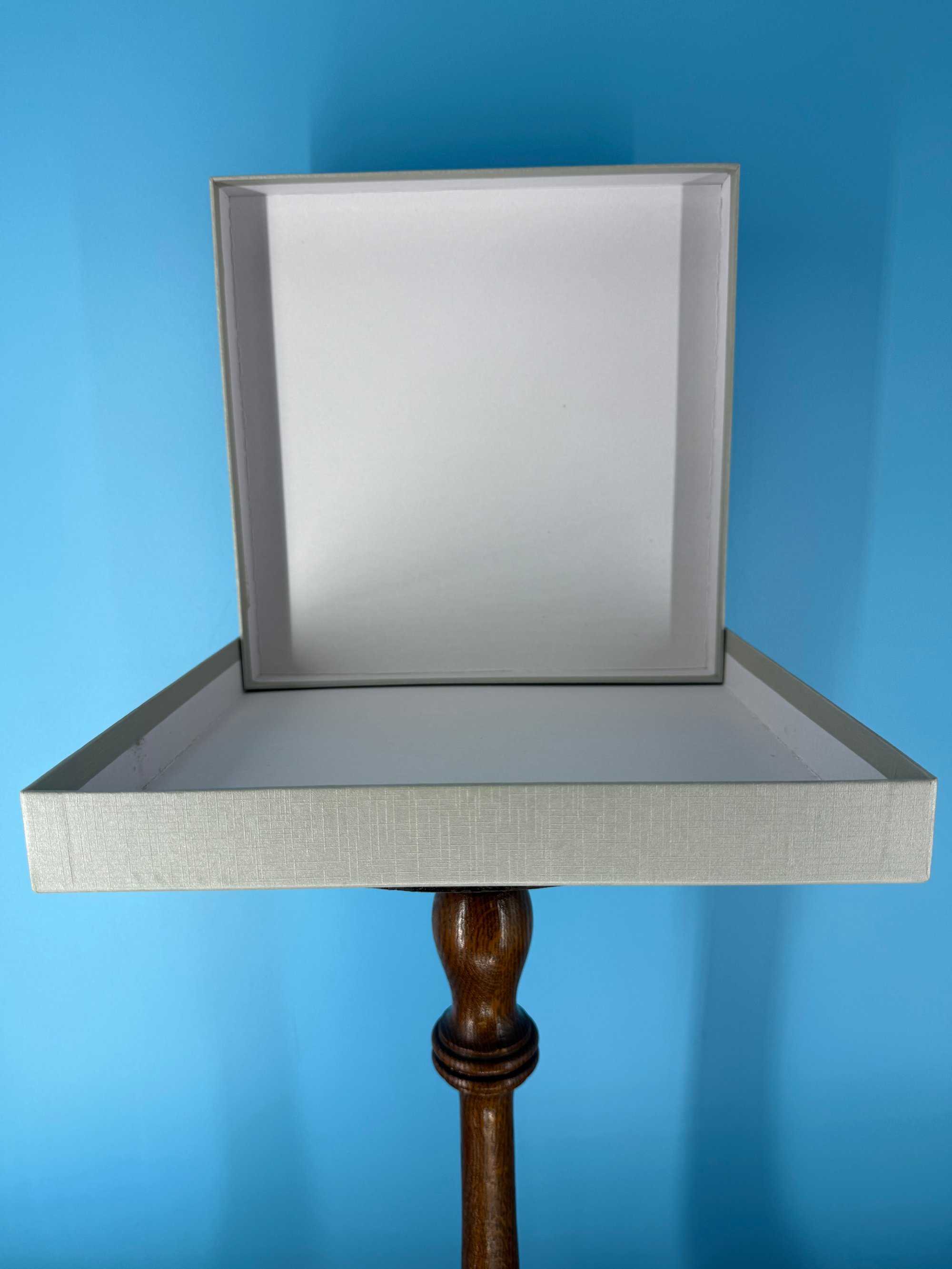 Archival-quality container made with Heavy Duty Professional thick matte Silver cardboard material and acid-free wrap..